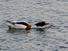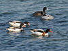 | 日光を受けると光沢のある緑色の頭部がなんとも美しいヨシガモ。数は多くはありませんが、和白干潟でも観察ができます。 秋になると次々とカモたちがやって来ますが、ツクシガモがやって来るのは冬本番の12月になってからです。和白海域に集団で群れていて他の場所にはほとんど移動しませんが、少数は奈多海域にまで出かけています。 ヨシガモ:全長約48cm ツクシガモ:全長約63cm ヒドリガモ:全長約48cm オナガガモ:♂全長約75cm ♀53cm |