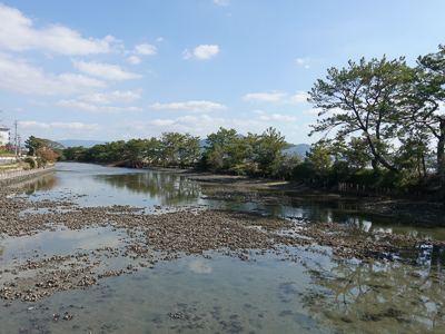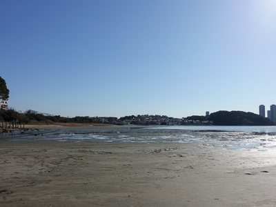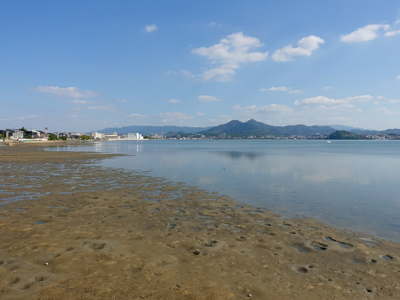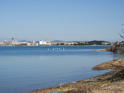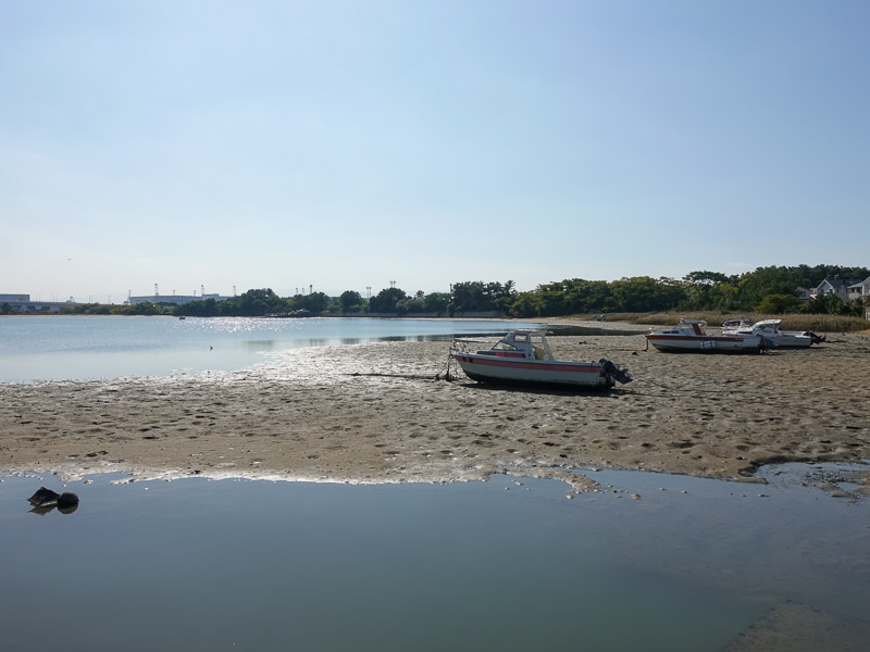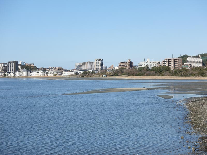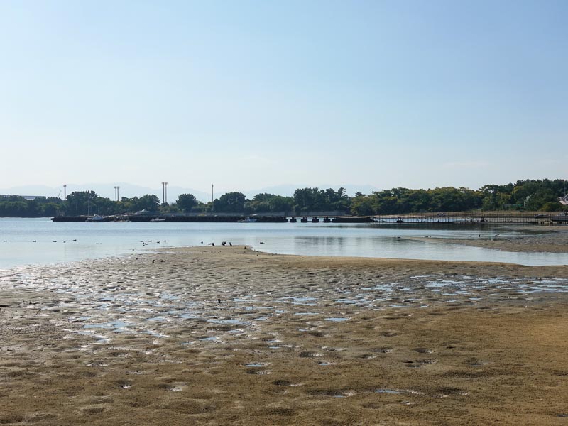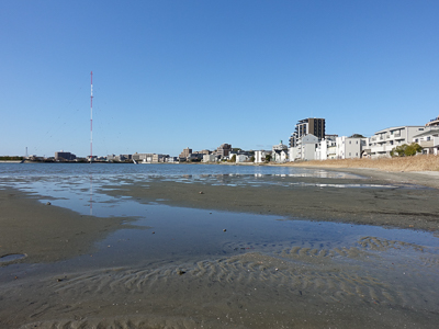 | 和白側の干潮時の様子。大潮の最干潮時は100mほど先までが干潟になります。先まで行くには長靴が必要ですね。遠方にみえるのは塩浜海岸です。 このような状況ではこちらの姿が丸見えなんで、水際の水鳥に近づくことは困難ですね。 |
