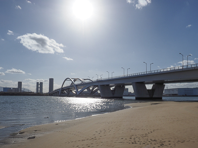 | 海の中道大橋の橋上からの和白干潟。満潮時にはミヤコドリなどが休憩している姿を見ることもあります。 | |