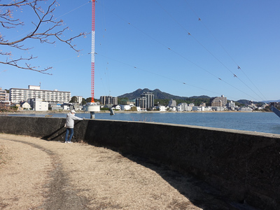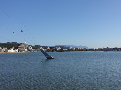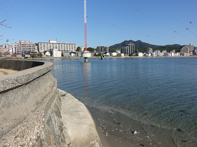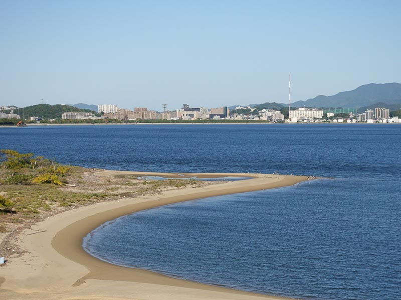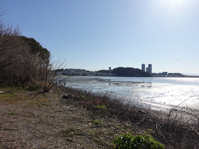 | 五丁川の河口から見た塩浜海岸。展望場所があります。その左側のスロープは、戦時中の水上飛行機の出入り場所だった名残です。この塩浜海岸を先に進むと奈多海岸です。 | |