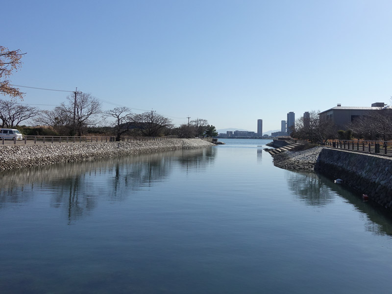 | 和白干潟と奈多団地の間の水路。ここでも渡り鳥が見られます。時にはクロツラヘラサギを見ることもあります。 | 奈多海岸散策路 ※現在はこの堤防が更新工事中で通行不可です。 |