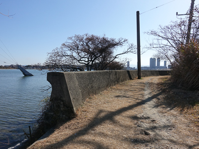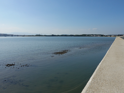 | 和白干潟も満潮時はここまで潮が上がります。この堤防がなかったら暴風雨、台風で、左側の農地などは相当な被害を受けるでしょう。堤防の原型は江戸時代に苦労の末に築堤されたそうです(上記の新開築堤記念碑を参照)。 | |