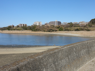 | 小さな河川(五丁川)の河口。この河口を挟んで両側が塩浜海岸。ここはカワセミの立ち寄り場所になっていて、ちょうど頃合いの潮どきにはカワセミに会える確率は高いです。 | |