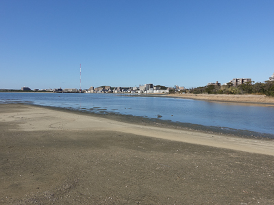 | 唐の原川河口に広がる干潟。背後は住宅地になっています。 | |