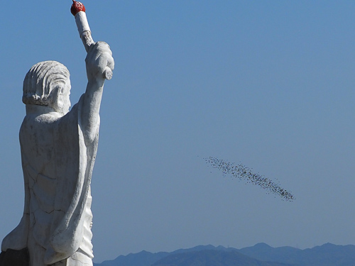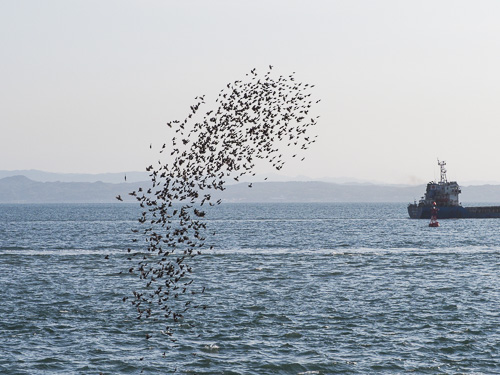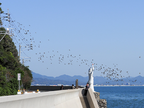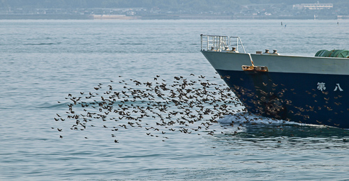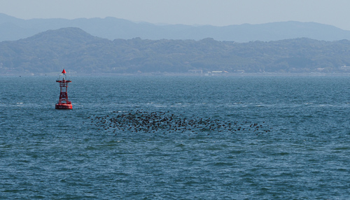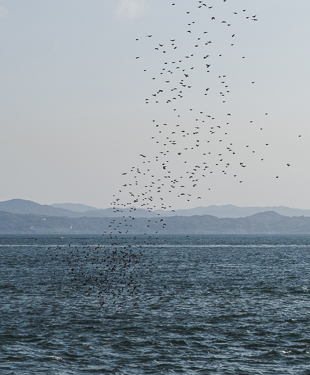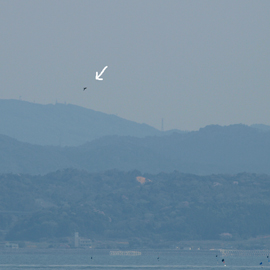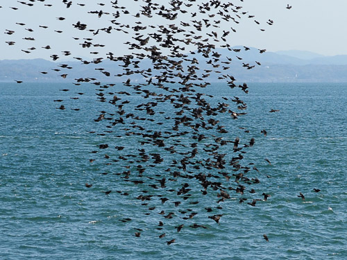 ここまでの大集団だったら引き返すことはありません。しばらく進むと、海面に向かって滝のごとく急降下です。この急な変化に、見物していた人たちは歓声を上げます。私も一緒に「ウワ〜〜」。 渡りの最中に船舶に出会うと、逆に上昇することもあります。このような光景からでしょうか、”竜の渡り”ともいわれています。 |