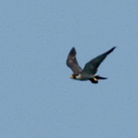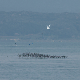超低空飛行で渡っていくのが通常のスタイル。他からの攻撃に対する防御はこれが一番ということでしょう。上空にだけ注意を払えばいいわけですから。 ”他からの攻撃”、それは猛禽類です。渡りのこの時を常に狙っています。 |