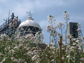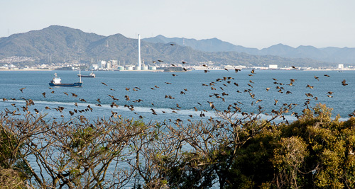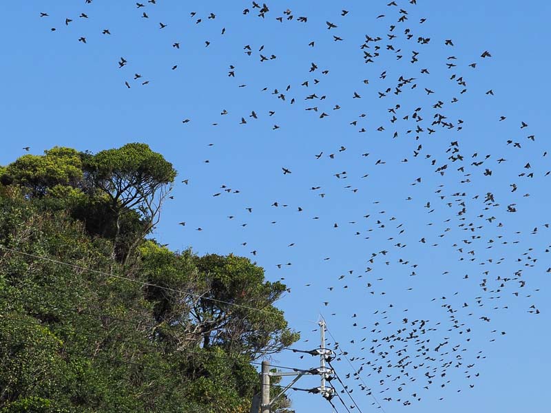 | 今まさに渡ろうとするヒヨドリが、合図をしたように一斉にこずえの間から飛びたちました。(灯台下からの撮影) 飛び出すその瞬間に遅れまいと、必死。遅れると猛禽類の攻撃目標になり、命がヤバイって知っているんですね。『みんなで渡れば怖くない!』って感じ。誰かが「サー行くぞ!」って声でもかけてるんですかね〜。 この集団が大きいか小さいかで、そのまま渡っていくのか、引き返すのかがある程度決まり、小集団にしかならないときは先頭集団が『今回はパス』ってんで途中から方向転換、それにつられて皆引き返し再挑戦です。 |