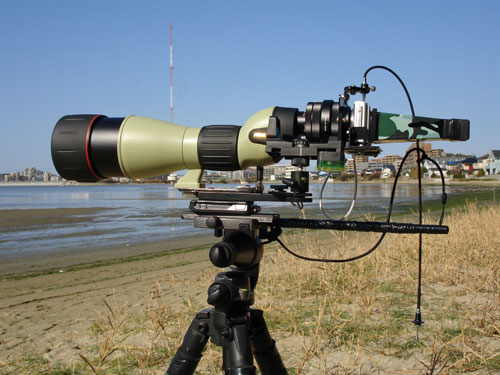 | 今はいろんな機材が市販で用意されています。照準器内臓の高倍率デジカメまであって、野鳥撮影も手軽にできるようになりましたね~。「あーでもない、こうでもない・・・」の試行錯誤も、けっこう楽しいんですけどね・・・工作の多くが過去の思い出になりました(2014年)。 |