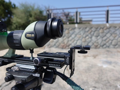 | スコープとの接続は、カメラレンズにステップアップリングを取り付け、その先に接眼レンズとの接続のためのNikon製「デジタルカメラアタッチメント