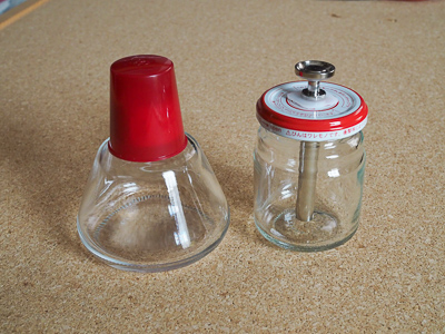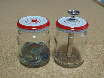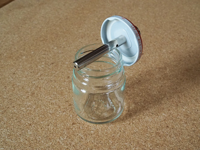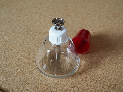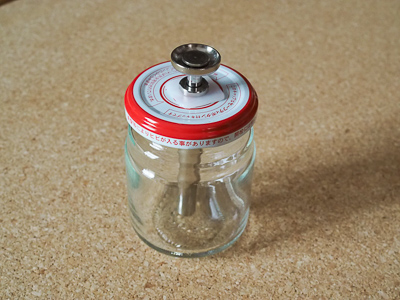 ある日、食事中に目の前の容器に目が留まりました。「これは使えるんじゃないか」ということで、早速、寸法を測ってみました。ばっちりでした。ハンドラップの為にあると思えるほどのスタイルのいい容器でした。それは・・・、「桃屋の”ごはんですよ!”中びん」でした。 ハンドラップのポンプ部分である金属筒の長さが約67mmなので、瓶の深さはそれより若干深い必要があります。このような瓶はジャム容器など、他にもいろいろありそうです。 蓋の貫通部分の径は約8.5mmですので、それに見合う穴をあけ塩ビ板で補強をしてポンプ部分を取り付けました。 注意:ハンドラップの金属筒の中には逆流防止用の小さな金属球が入っています。筒を取り外したときに逆さにすると出てきますので、なくさないように。 |