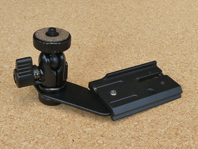 スコープとカメラとの接続をステップアップリングを使用して行うのは、軽いミラーレス一眼とはいえ信頼性の面でちょっと不安です。 そこで、カメラ三脚穴を利用して、ミニクランプを使った自作サポートで下部から支持しています。ブレ対策にもなりますね。 このサポートは3D方向に調整ができます。これを使えば、コンパクトデジカメもセット可能です |