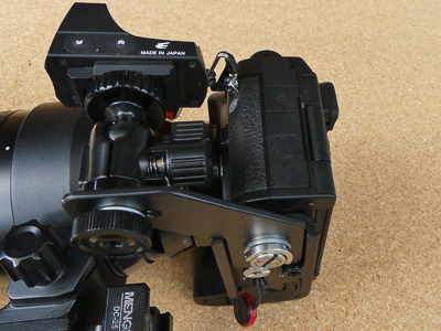 デジスコにとっては照準器は切っても切れない縁、親子みたいな関係ですネ。 望遠鏡だけで野鳥をとらえようとすると「ここでもない、こっちでもない」と時間の浪費。相当の才能の持ち主以外は、これがなければ望遠鏡ですばやく野鳥をとらえられません。本体のバランスプレートにセットして使っています。 これまでいろいろと試行錯誤の結果、今は小さな自由雲台をセットしています。使い勝手はGOODです。 照準器にスィッチを取り付けました。 |